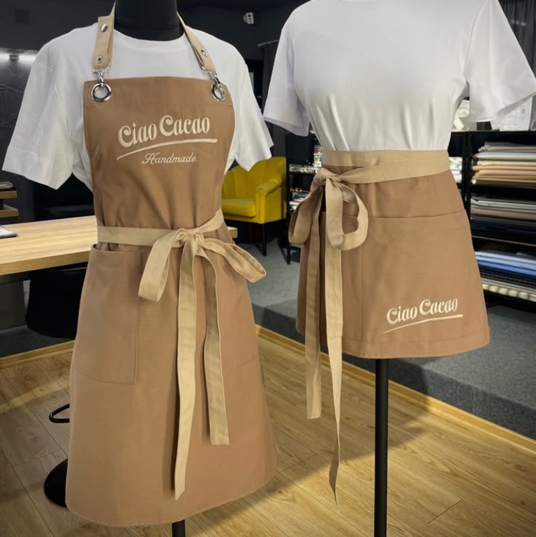 Phù hợp với các quán cafe concept cổ điển hoặc nhà hàng mang hơi hướng thủ công. Sử dụng chất liệu vải Canvas, đũi hoặc vải thô kết hợp với tạp dề da bò tạo nên vẻ ngoài cực kỳ “nghệ” và ấm cúng.