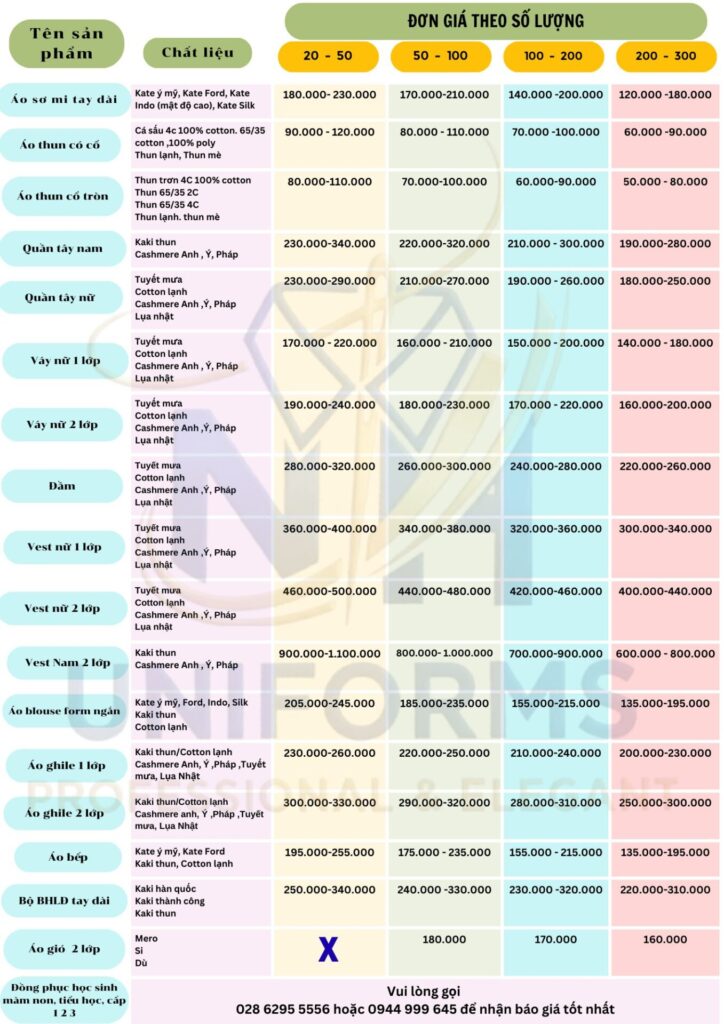 Các gói dịch vụ trọn gói tại Nhị Hồ Uniform bao gồm:
